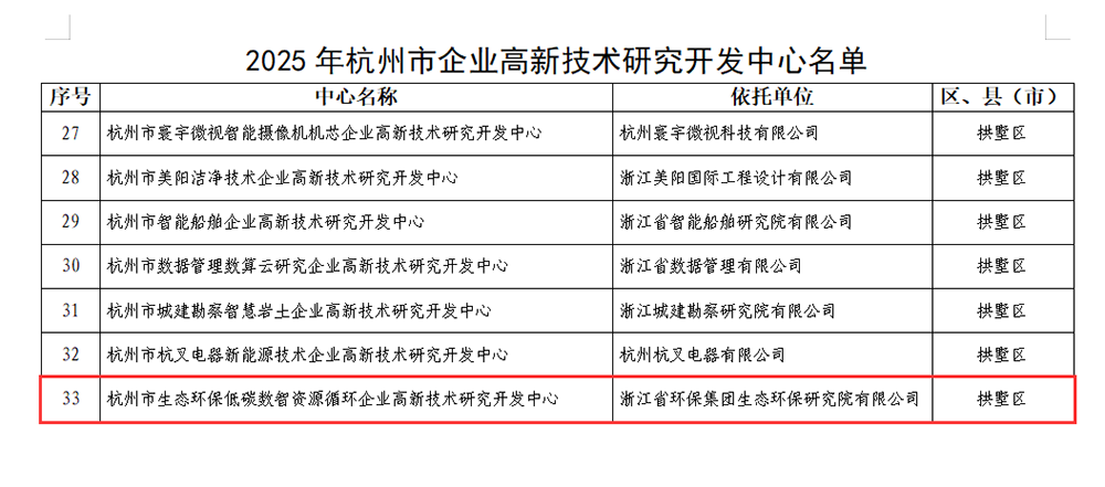 近日,由浙江省环保集团生态环保研究院有限公司创建的“杭州市生态环保低碳数智资源循环企业高新技术研究开发中心”,成功入选2025年杭州市企业高新技术研究开发中心名单,标志着生态环保研究院在科技创新领域取得重要突破,迈入新的发展阶段。