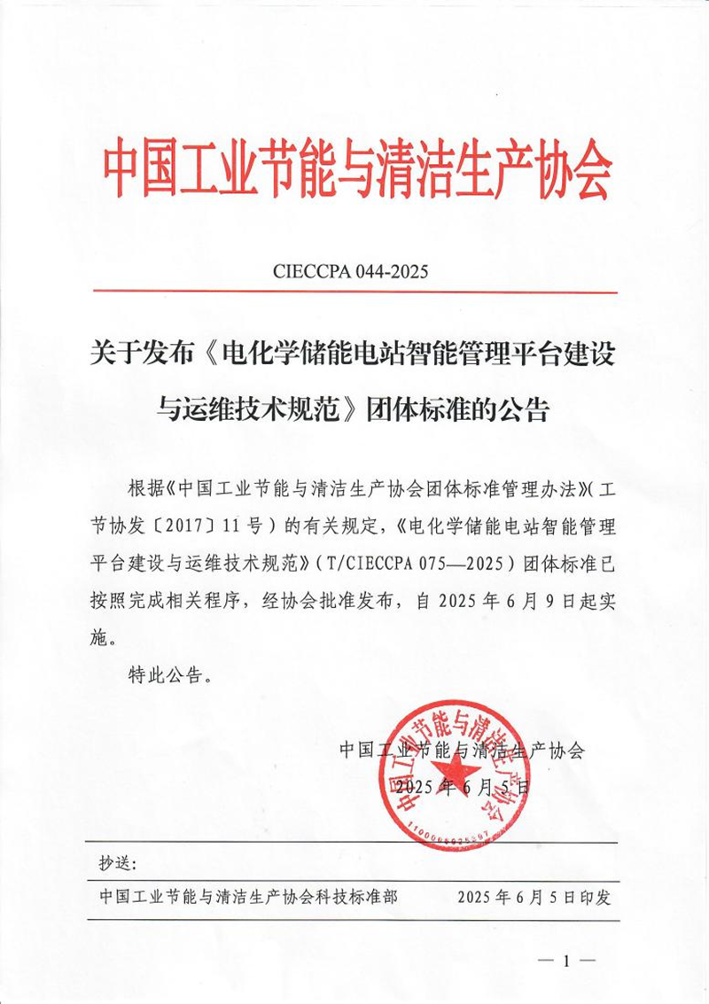 近日,由浙江省环保集团宁波环新能源有限公司牵头,联合宁波钢铁有限公司、浙江省环保集团生态环保研究院有限公司等单位共同起草的《电化学储能电站智能管理平台建设与运维技术规范》(T/CIECCPA 075-2025)与《温室气体 产品碳足迹量化方法与要求 电化学储能电站电力》(T/CIECCPA 087-2025)两项团体标准,已由中国工业节能与清洁生产协会正式发布,并分别于2025年6月9日、8月28日起实施。该两项标准的出台,有效填补了电化学储能领域在智能化管理与碳足迹量化方面的关键技术空白。